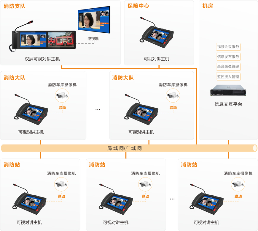系統基于IP網絡架構,以高清音視頻通訊技術為核心,構建了一套功能完善、實時性高、擴展性強的聯網式音視頻實時交互平臺,實現消防支隊指揮中心通過現有消防平臺聯動對講系統、到達與消防大隊、各消防站之間的快速建立視頻通話、視頻會議、錄音錄像、通知發布等功能。