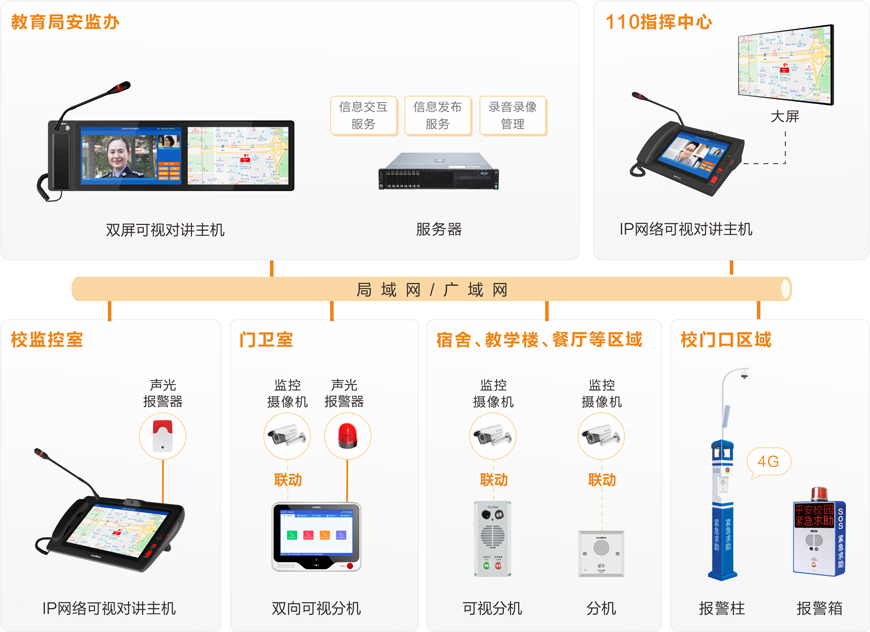 來邦學(xué)校一鍵報警可視對講系統(tǒng)基于IP網(wǎng)絡(luò)架構(gòu)(可跨網(wǎng)段跨路由),以高清音視頻編解碼技術(shù)為核心,構(gòu)建了一套功能完善、擴(kuò)展性強、實時性高的聯(lián)網(wǎng)式音視頻實時交互平臺,實現(xiàn)教育局、110指揮中心對轄區(qū)內(nèi)校園突發(fā)事件的應(yīng)急響應(yīng)與遠(yuǎn)程指揮。