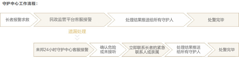 ? 當民政監管平臺客服遺漏處警時,來邦24小時守護中心客服立即參與處警,為長者守護提供兜底保障。